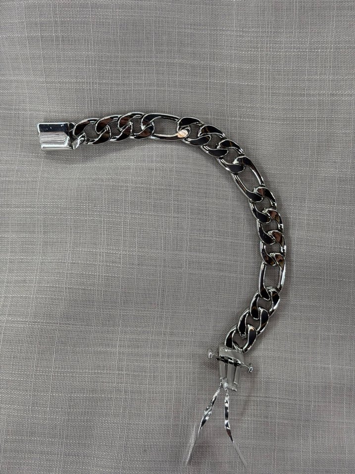 Gri renkte zincir detaylı unisex bileklik, minimalist tarz ve günlük kullanım için uygundur. Sokak modasına uygun bir tasarıma sahiptir.