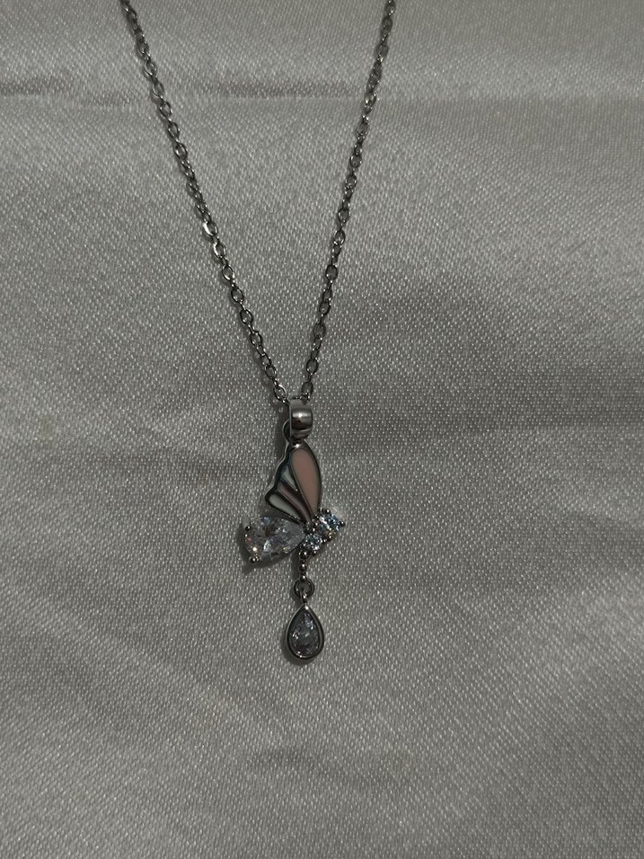 Gri renkte, detaylı zincirli ve taşlı kelebek figürlü uzun kadın kolye, günlük kullanıma uygundur.