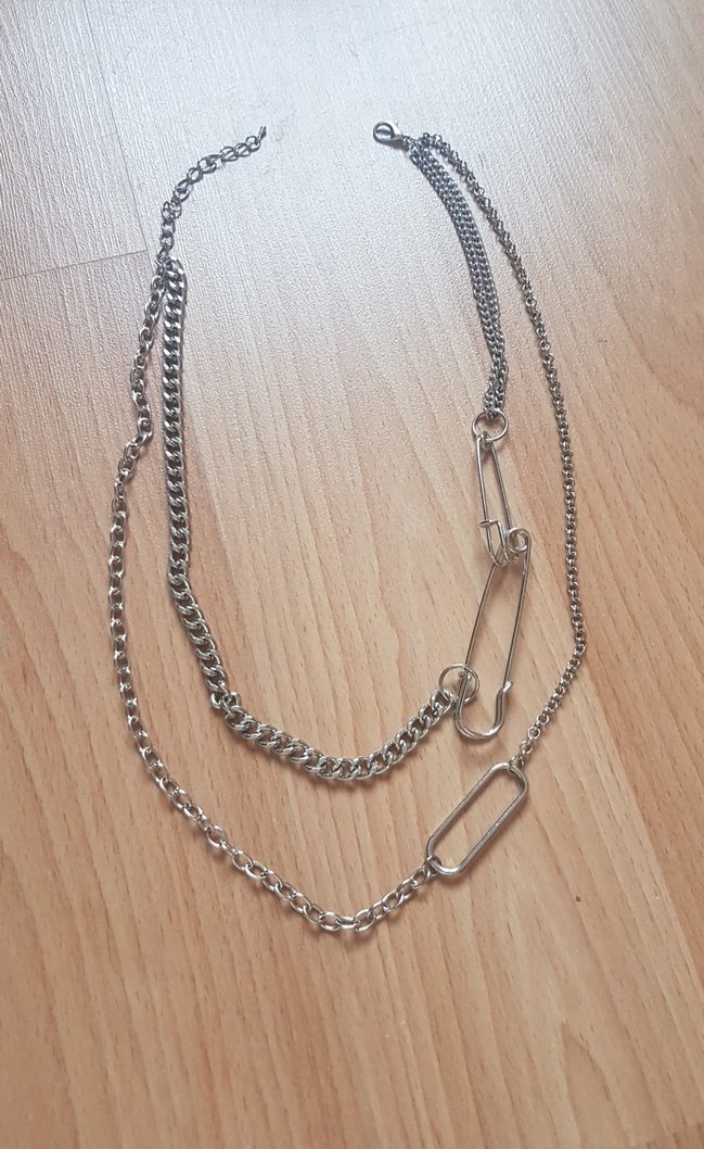 Farklı zincir stilleri ve emniyet iğnesi detaylarıyla gri uzun kadın kolyesi, minimalist ve avangart tarzı günlük kullanım için uygundur. Hiç kullanılmamıştır , kararma ve alerji yapmaz