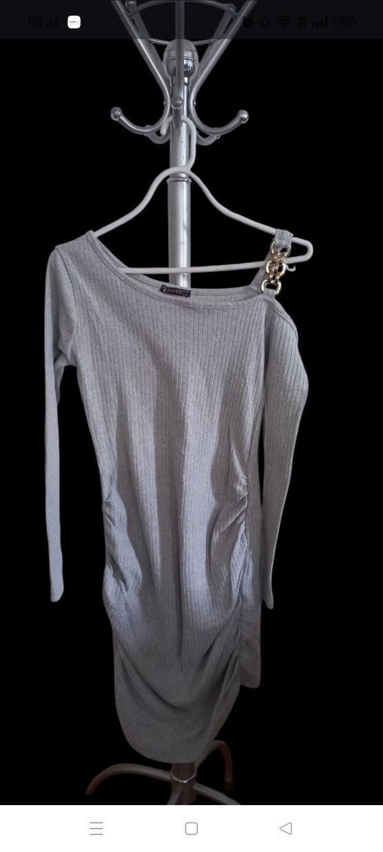 Gri renkte, zincir detaylı, uzun kollu, triko kumaştan, fitted kesim günlük sokak stili elbise.