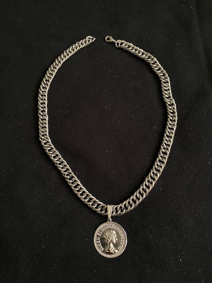 Gri renkte, zincir detaylı ve yuvarlak yılan desenli vintage kolye. Midi uzunlukta olup günlük kullanım için uygundur. Yenidir