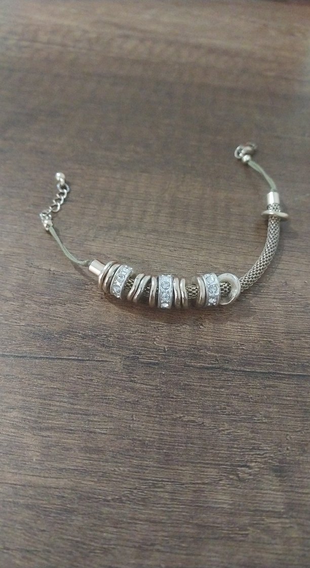 Gri zincir detaylı, bej yılan desenli bu bohem bileklik, günlük kullanıma uygun rahat ve şık bir tasarıma sahiptir.