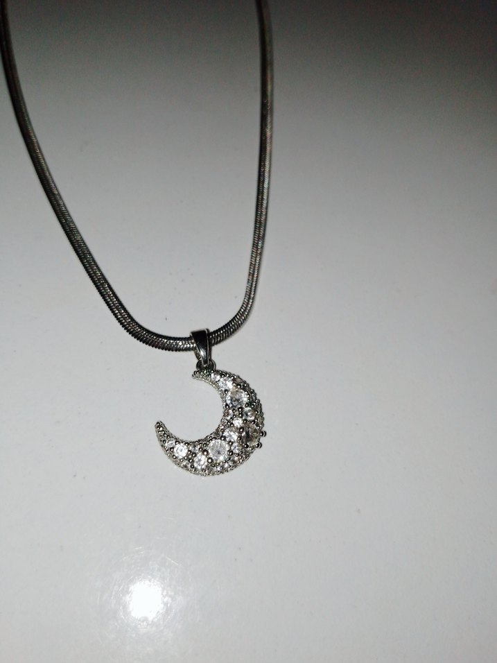 Gri zincirli, ay şeklinde küçük taşlı kolye, normal midi uzunlukta ve yılan derisi desenli. Minimalist ve gotik tarzlara uygun.