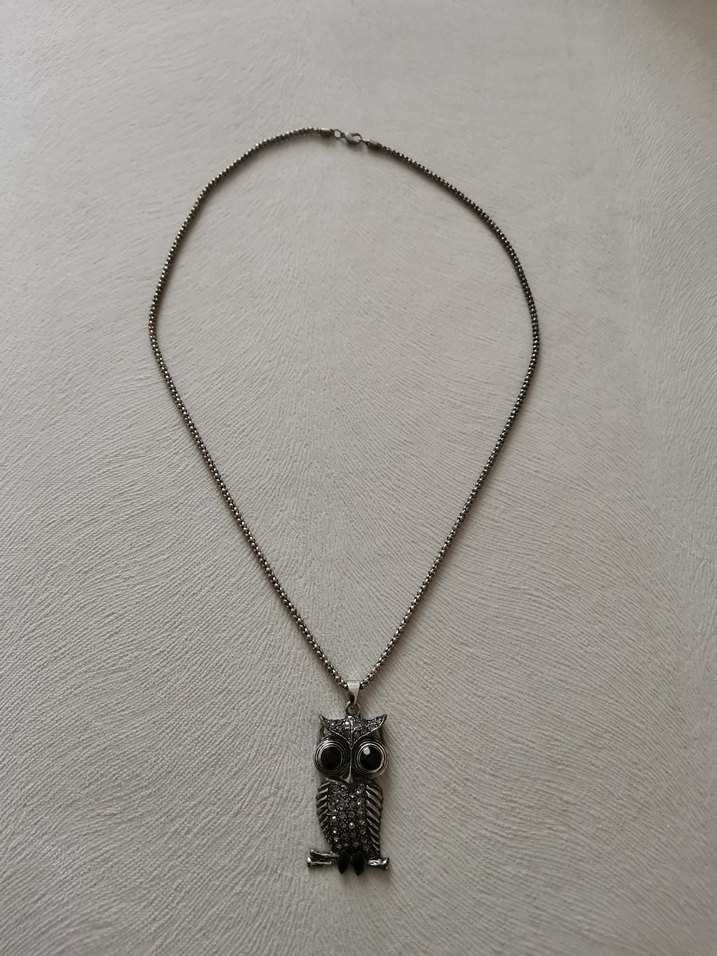 Gri zincirli, siyah gözlü detaylı baykuş figürlü kolye. Normal midi uzunluğunda, gotik ve bohem tarzlara uygun.