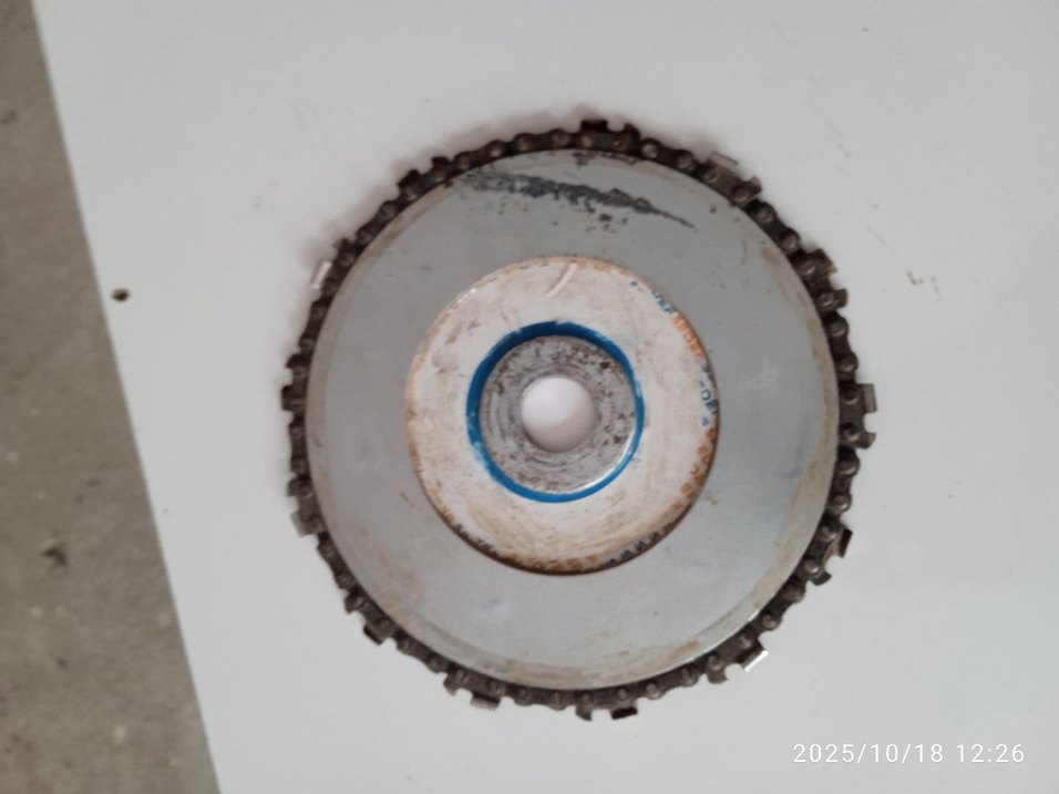 Kullanılmış, ortasında mavi halka bulunan gri zincirli fan dişlisi. ⚙️