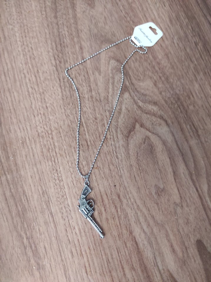 Gri zincirli ve yılan desenli tabanca figürlü kolye, vintage rock punk tarzını yansıtır. Normal midi uzunlukta, günlük kullanıma uygundur.