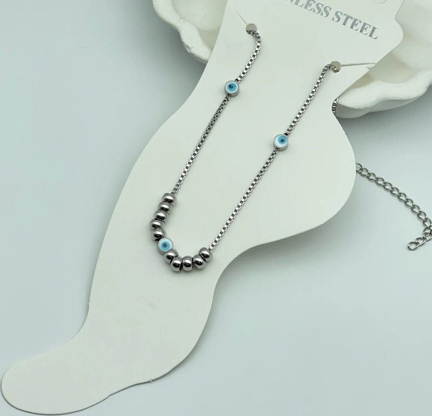 Gri zemin üzerinde turkuaz nazar boncuğu detaylı, zincir tasarımlı minimalist kadın el zinciridir. Günlük kullanıma uygun yılan desenlidir. SSSTE yazılıdır.