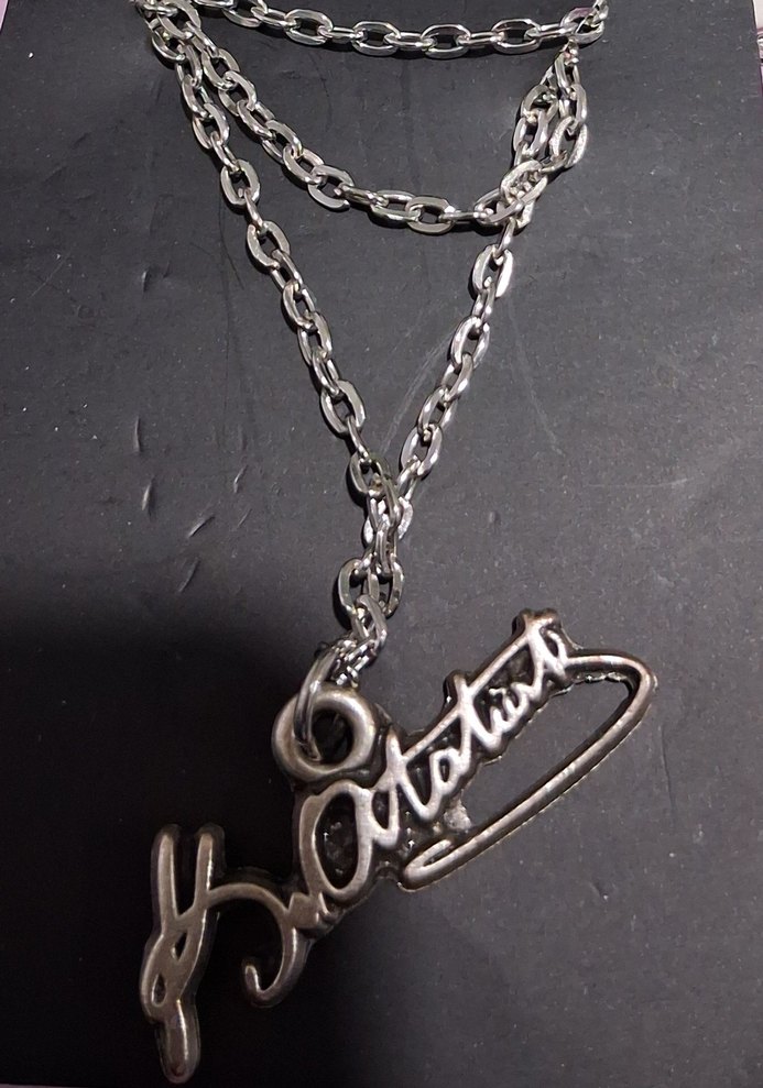 Gri zincirden oluşan, vintage tarzı yazı tasarımlı erkek kolye, rock punk havası için uygun.