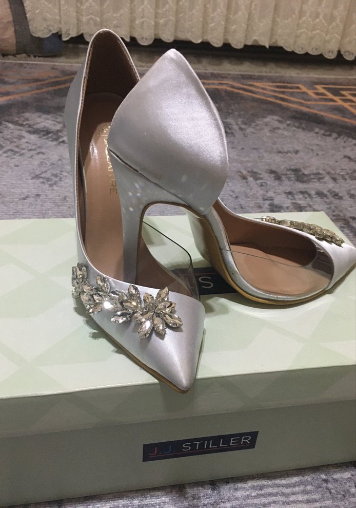 Beyaz saten gecelik ayakkabılar, stiletto topuklu ve işlemeli, pullu çiçek detaylarıyla düğünler için uygundur. Marka: USTILLER. 39 numara