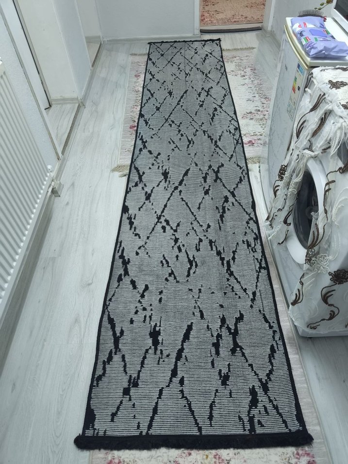 eni 80 sm boyu 4 mt yolluk kayma yapmaz taşındıgım için evime küçük geliyor temiz göründügü gibi yıkandıktan sonra 1 ay kullandım makinada yıkanıyor çizgi var üzerinde ben aldıgımdada bu şekildeydi bilginize püskül detaylı püskülüne çamaşır suyu degmiş galiba resimlerde var bakın lütfen