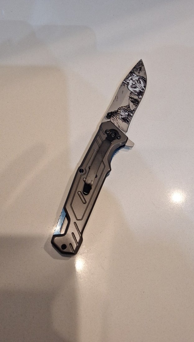 Karanlık gri sap ve bıçağında detaylı grim deseni olan katlanır çakı, işlevsellik ve dikkat çekici görünümü birleştirir.
