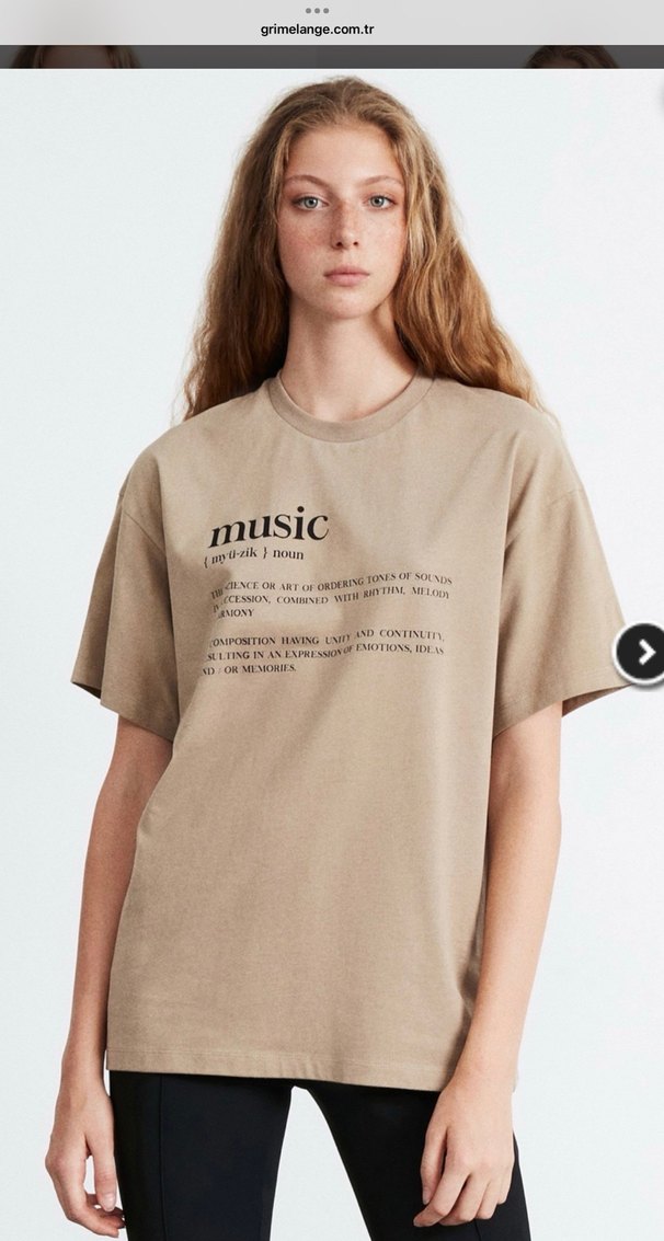 Bej renkli pamuk tişört, baskılı 'music' yazısı, kısa kollu ve yuvarlak yakalı, rahat kesimle günlük kullanıma uygun.