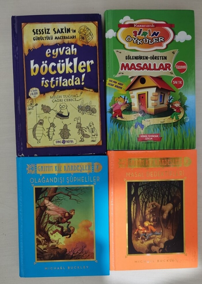Grimm Kız Kardeşler Masal Dedektifleri iki cilt. Ayrıca Eyvah bücürkler istilada, Eğlendiren öğreten masallar. Toplam 4 kitap