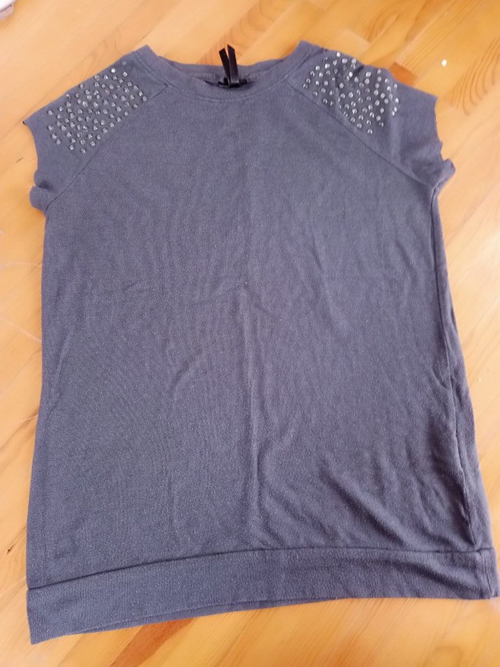 Yumuşak denim kumaştan, kısa kollu ve yuvarlak yakalı gri hamile tişörtü. Omuzlarda çıtçıt detayları ve bol kesim ile rahat bir görünüm sunar.
