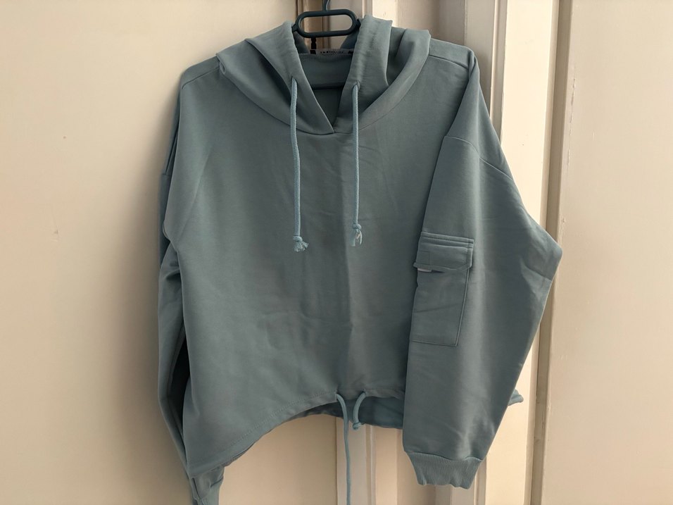 Uzun kollu, kapüşonlu ve rahat kesime sahip kadın sweatshirtü. Yumuşak ve sıcak kumaştan üretilmiş, yan cep ve ayarlanabilir bağcık detaylarıyla günlük rahat stil sunar. Herhangi bir defosu yok. 1-2 kere giydim