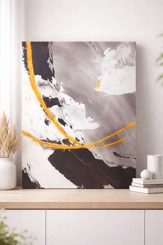 Grinin tonlarında ve altın renkli detaylarla soyut bir tablo, modern ve dinamik bir görünüm sunar.