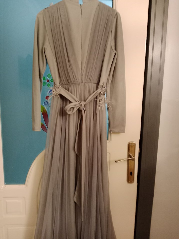 gri renkte, uzun kollu ve salaş kesim bohem tarzda uzun elbise. Drapeli detaylara ve kuşaklı bağlamaya sahiptir. Düğünler için uygundur.