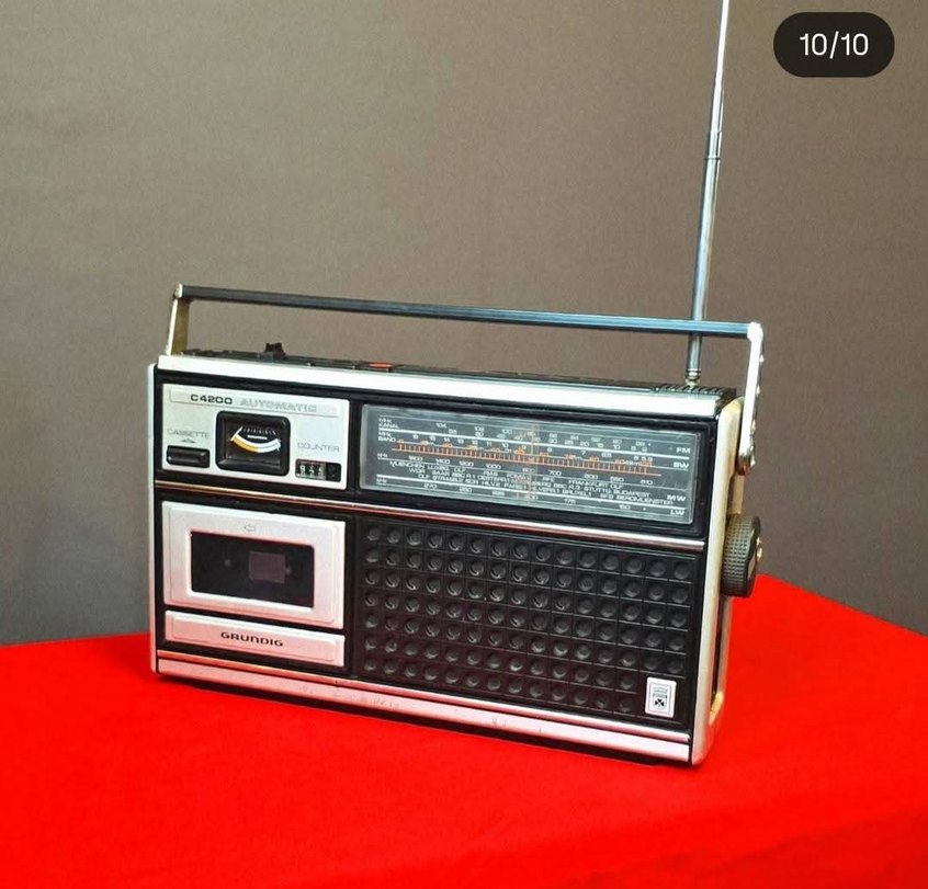 Grundig (Almanya) Model C4200 Automatic Üretim Dönemi: 1970’lerin sonu 1980’lerin başı Tür Taşınabilir radyo kasetçalar (mono) FM (UKW) MW (Orta dalga) LW (Uzun dalga Avrupa yayınları için) Tuning: Analog (mekanik ibreli) Anten: Uzatılabilir teleskopik anten Hoparlör Ön yüzde büyük tek hoparlör (mono ama güçlü ses) Ses Karakteri Dengelisıcak ve tok (Grundig’in meşhur olduğu ton Pille Çalışma Büyük boy piller (genelde D tipi) Adaptör Harici adaptör girişi mevcut Pil Seviyesi Ön panelden izlenebilir ürün sıfır ayarında mükemmel kondisyon tüm fonksiyonları kusursuz çalışıyor