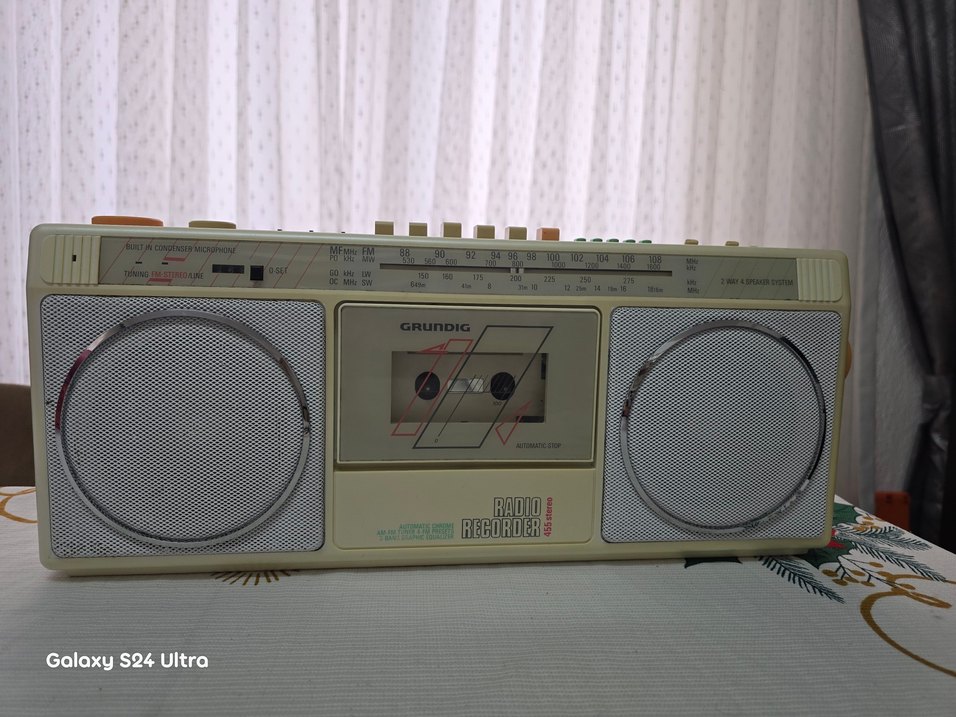 Bej renkli Grundig müzik sistemi, kaset çalar ve radyoya sahiptir. Çoklu frekans bantları ve otomatik durdurma özelliği bulunur.