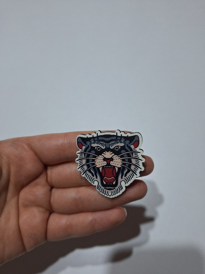Koyu gri renkte, asi ruhlu grunge punk tarzına uygun siyah kaplan başı desenli rozet.