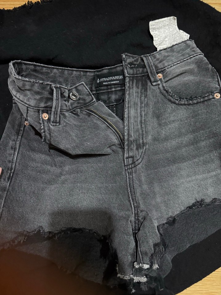 Gri renkte, ince kesim ve tokalı detaylı mini denim şort. Grunge punk esintili, günlük sokak stili için uygun.
