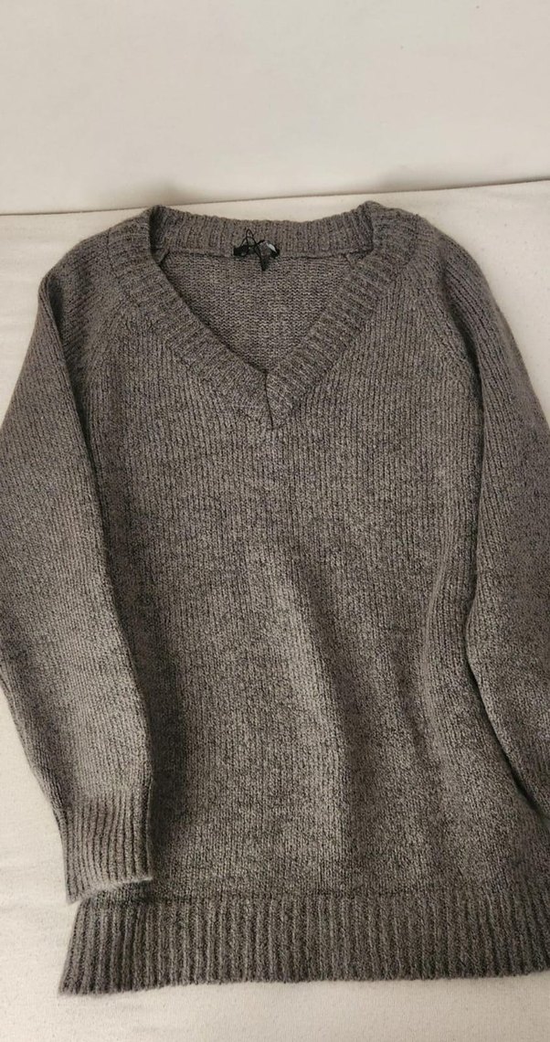 Gri renkli, yumuşak %100 akrilik kumaştan örülmüş kadın kazak. bol kesim ve günlük kullanıma uygun. L- XL uyumlu
