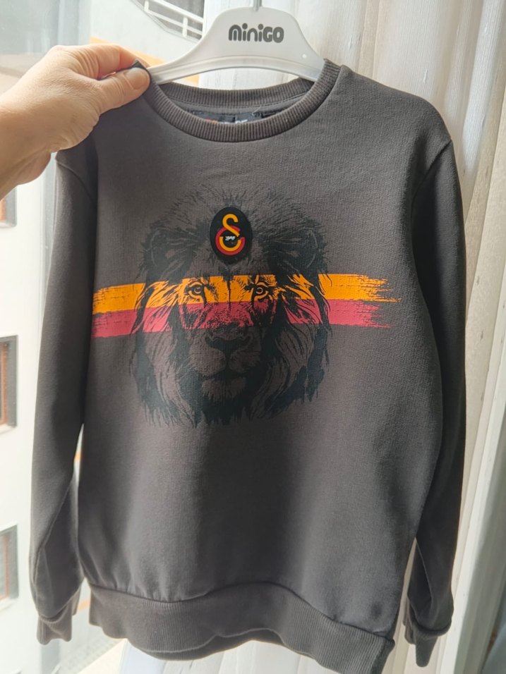 Yumuşak kumaştan, uzun kollu, bisiklet yaka, bol kesim erkek çocuk sweatshirt. Koyu gri ve kürk detaylı aslan baskılı. Orjinaldir. 5-6 yaş, sorunsuz.