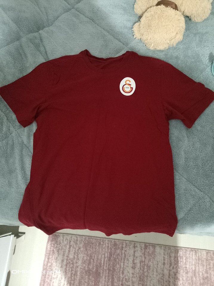 Kısa kollu, yuvarlak yaka, koyu kırmızı erkek tişörtü. Gevşek kesim, baskılı logo detaylarına sahip, yumuşak ve sıcak kumaştan üretilmiştir. Rahat sokak stili için uygundur.