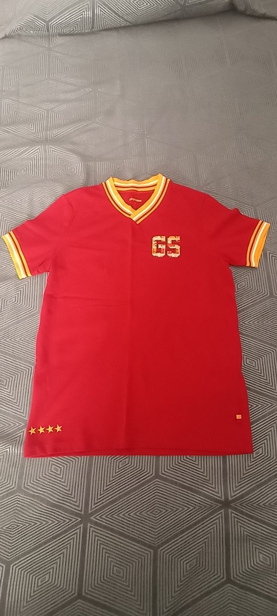 GS Store orjinal sıfır t-shirt Kısa kollu, V yaka ve bol kesim kırmızı spor tişörtü. Sarı-turuncu çizgili yakası ve kol manşetleri, "GS" baskılı ve düğmeli detaylarla renkli tasarım sunar. ⭐
