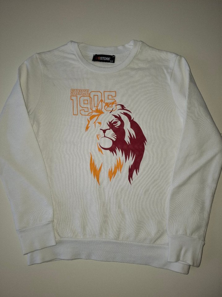 Beyaz renkli, uzun kollu ve yuvarlak yakalı erkek çocuk sweatshirtü. Yumuşak ve sıcak kumaş üzerine renkli aslan baskısı ve kürk detayları bulunur.