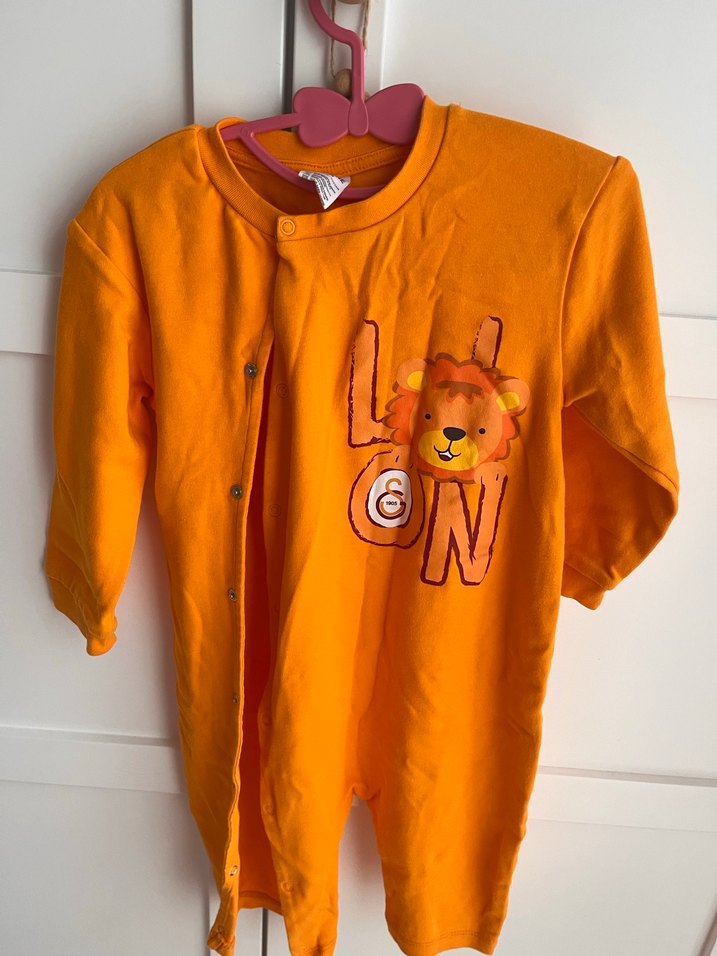 Yumuşak fleece kumaştan yapılmış, turuncu renkli uzun kollu bebek tulumu. Baskılı aslan deseni ve düğmeli kapama özelliği vardır.