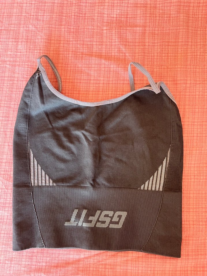 Siyah ve gri baskılı, ince askılı spor sütyeni. Street wear tarzında rahat ve modern tasarım. Çok sıkı tutuyor. Defosu yok. Sadece askıları çok uzun olduğu için ben biraz kısalttım kendim diktim tekrar üstünden geçilirse iyi olur normalde çok pahalı ama uyguna koyuyorum. Xxs/xs beden. Eğer s bedenseniz ve beliniz inceyse olur