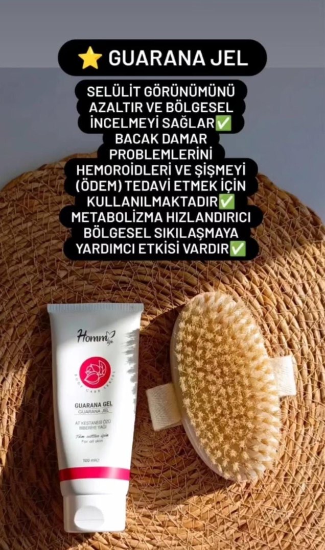Guarana jel, selülit görünümünü azaltır ve bölgesel incelmeye yardımcı olur. Bacak damar problemleri, hemoroid ve şişme (ödem) tedavisinde kullanılır. Metabolizmayı hızlandırır ve bölgesel sıkılaşma sağlar.
