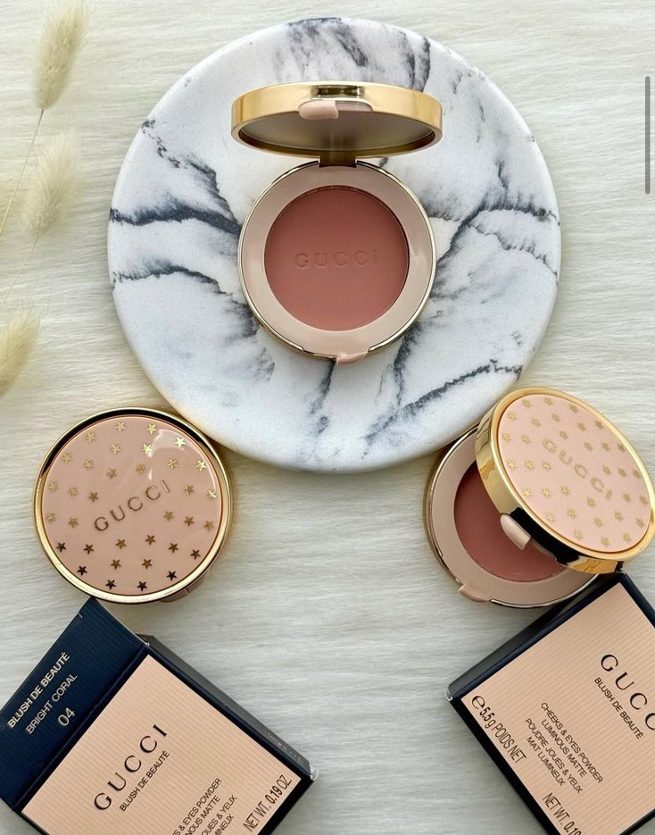Gucci açık bej allık, aynalı kompakt kutuda. Yumuşak dokusu doğal bir görünüm sağlar.