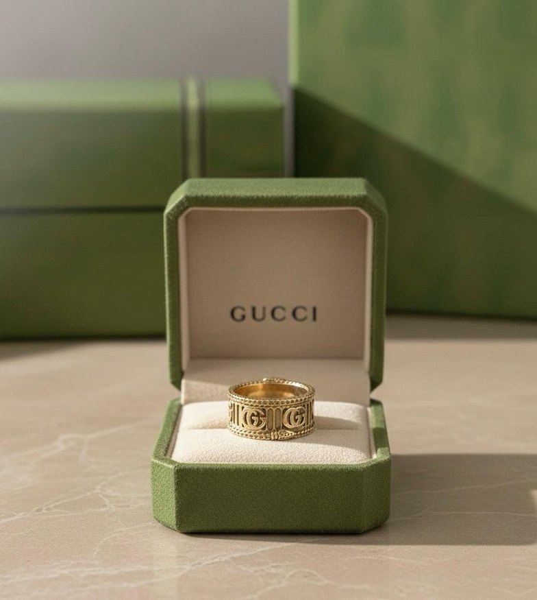 Parlak altın Gucci yüzük, baskılı deseni ve elastik yapısıyla klasik zarafet ve modern stili birleştirir, düğünler için uygun.