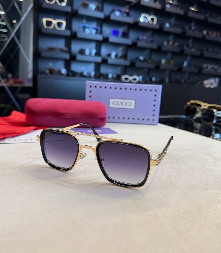 Gucci erkek güneş gözlüğü, altın renkli çerçeve ve koyu degrade camlarla klasik ve trend sokak stili sunar. ️