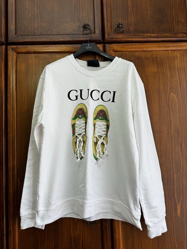 Gucci model, ön yüzünde ikonik ayakkabı baskısı bulunan beyaz sweatshirt. Birinci sınıf (A kalite) replikadır; baskı kalitesi oldukça canlıdır ve kumaş dokusu tok bir yapıdadır. Etiketi Gucci logoludur ve kondisyonu 10/10 durumdadır; hiçbir solma veya deformasyon bulunmamaktadır. XL beden uyumludur, kalıbı oldukça rahattır. Şık ve farklı bir sweatshirt arayanlar için ideal bir parçadır. Alıcısına hayırlı olsun.