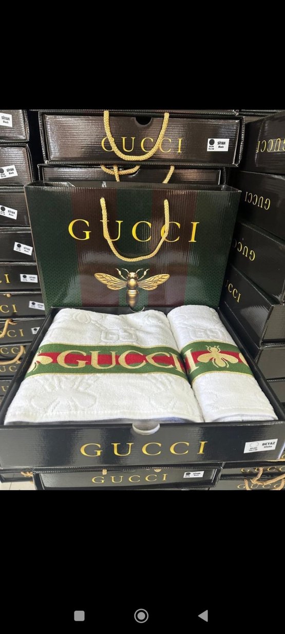 Beyaz havlular, koyu renkli baskılı Gucci logosu ve arı deseni ile sokak stili sunar. Gucci marka hediye kutusunda gelir.