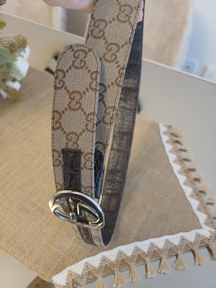 . gucci baskılı keten kumaş kahve deri aksesuarlı tokalı kemer