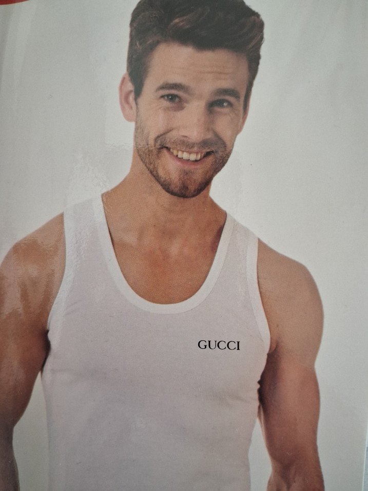 Dar kesim beyaz erkek atlet, göğüs kısmında parlak baskılı GUCCI logosu ile normal midi boydadır. Athleisure tarzı için uygundur.