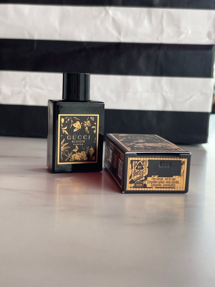 Gucci Bloom kadın parfümü, 5ml siyah şişede, üzerinde çiçek desenli etiketle. Detaylı çiçek desenli kutusunda sunulur.