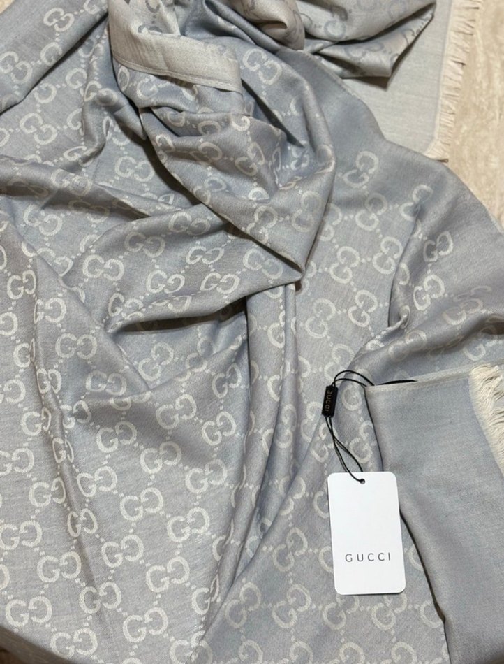 Gucci markalı gri pamuklu şal, drapeli tasarımı ve ince logo desenleriyle rahat ve şık bir görünüm sunar. ️