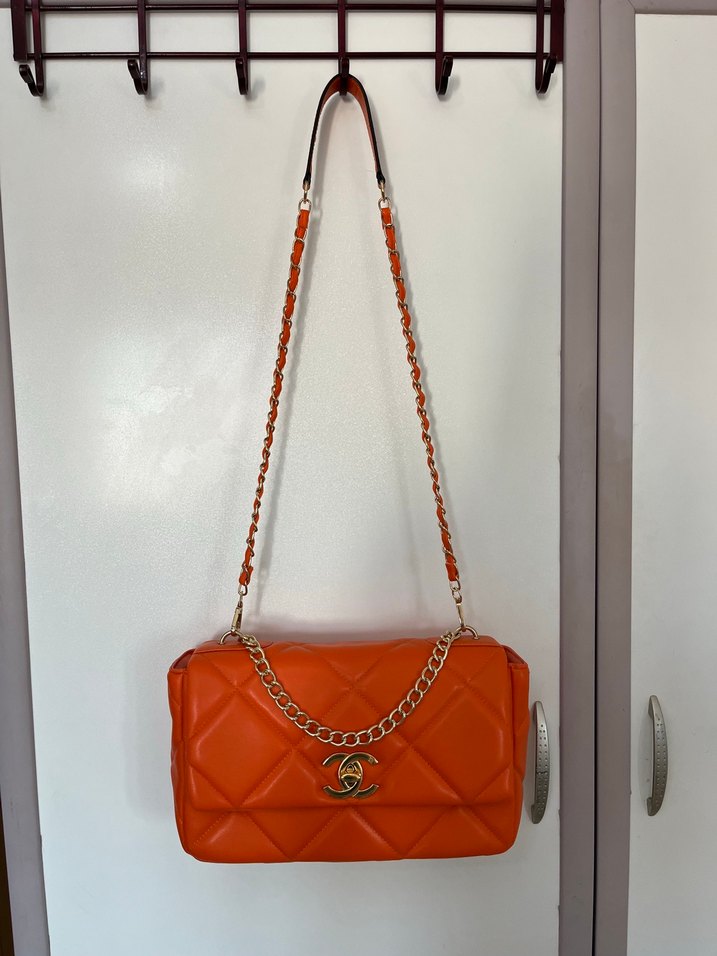Turuncu deri, zincir detaylı kadın çanta yenidir fakat depoda logo kısmı çizilmiş ondan kaynaklı yarı fiyatına koyacagım replikadır