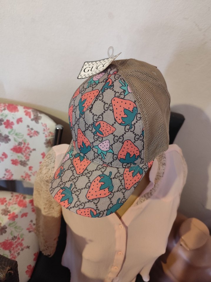 Gucci kadın şapka, ben taban üzerinde renkli çilek desenine ve nefes alabilir file arka kısma sahiptir, sokak stili için uygun .