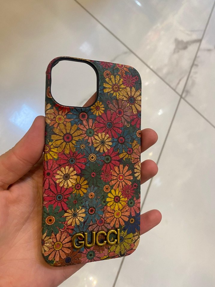 Gucci logosu ve çok renkli bohem çiçek desenli parlak telefon kılıfı.