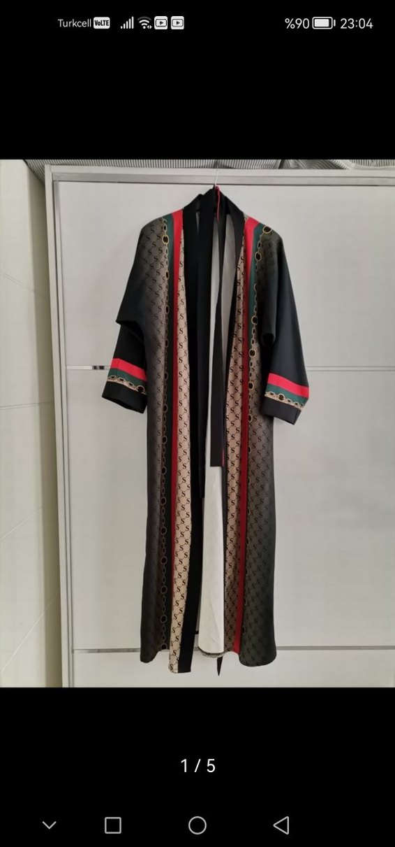 Sentetik kumaştan yapılmış, uzun ve drapeli kadın kimono. Koyu yılan desenli, notlu yaka, uzun kollu ve rahat kesim. Günlük kullanıma uygun bohem tarzda.