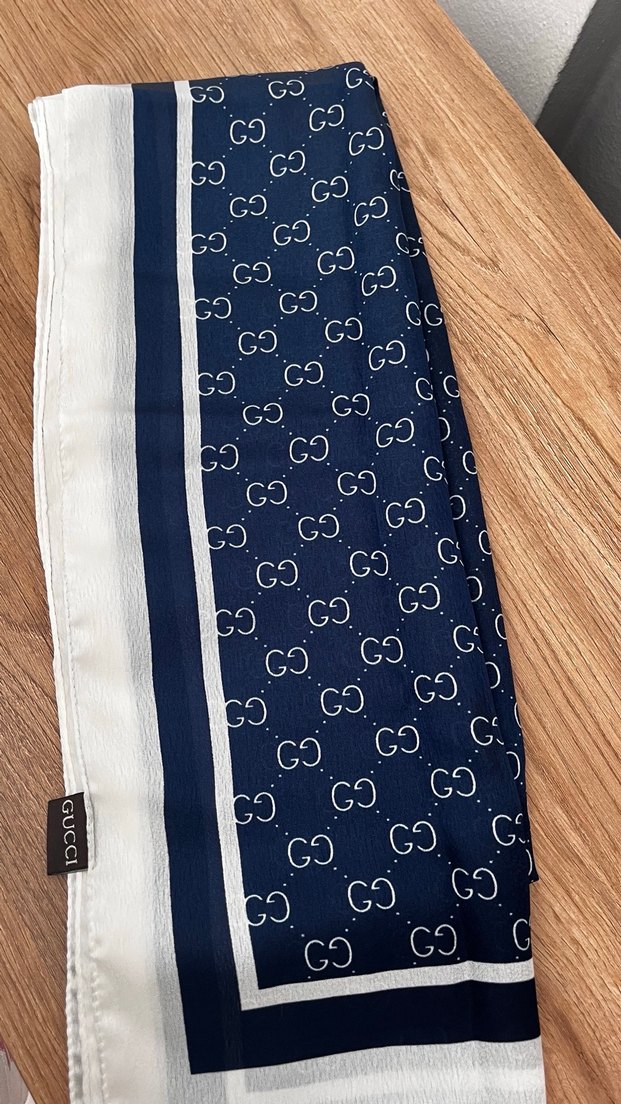 Parlak mavi sentetik kumaştan, zincir detaylı kadın şal. Paris sokak modasını yansıtan Gucci logo desenli trendy bir parça.