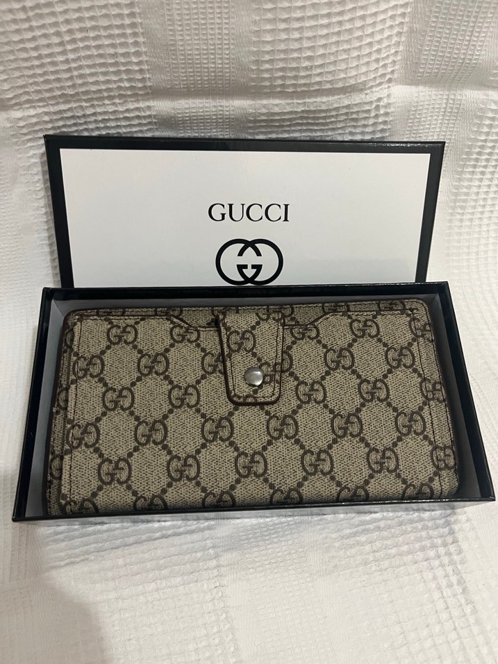 Gucci erkek deri cüzdan, kahverengi baskılı deseni ve tokalı kapanışıyla modern klasik tarzı günlük kullanım için sunuyor. Paris şıklığını yansıtıyor.