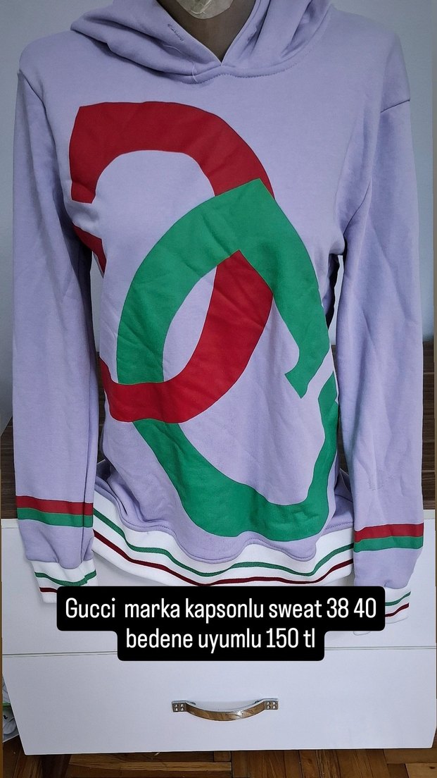 Gucci markalı, kapüşonlu, uzun kollu, pamuklu örgü kumaştan yapılmış, mor renkli ve baskılı rahat kesim sweatshirt. 38-40 bedenlere uygundur.