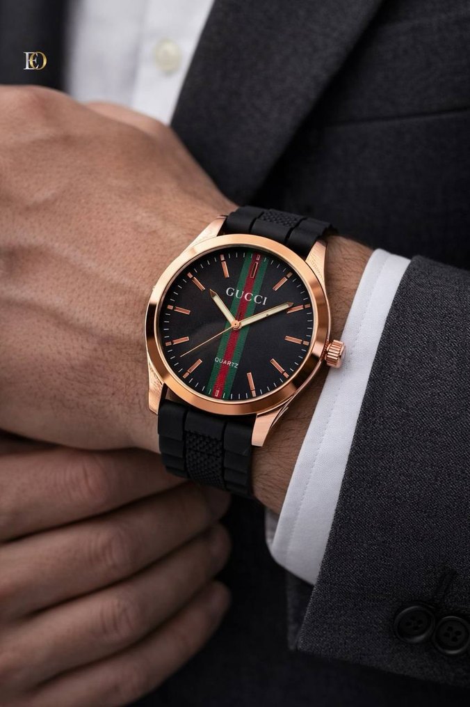 Gucci erkek saati, siyah kadranında kırmızı ve yeşil detaylar, rose gold kasa ve siyah dokulu kayış ile klasik ve street wear tarzını birleştirir. ⌚
